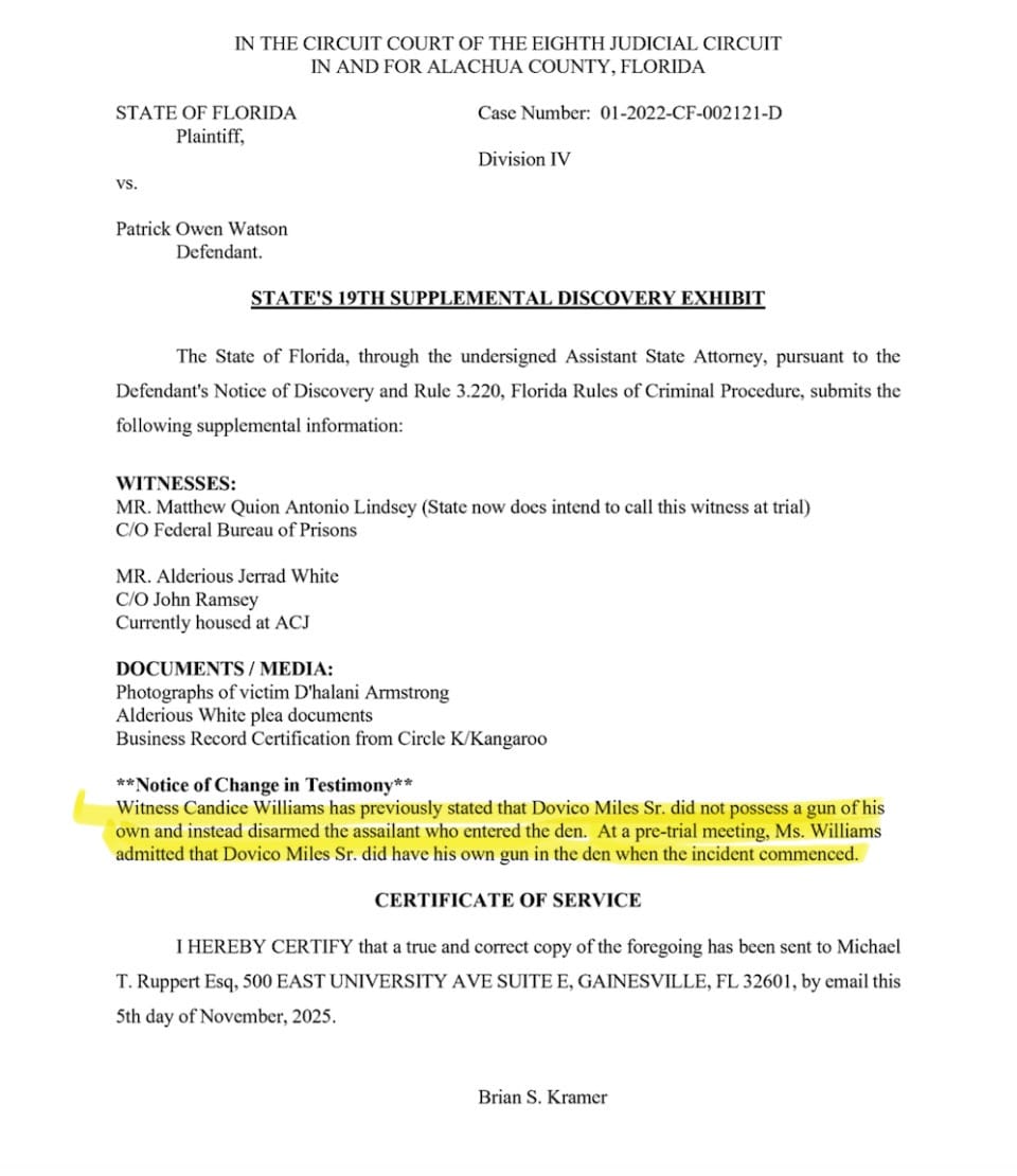 It is widely reported in several news articles and the police reports that Ward’s gun went off during a struggle with Miles, and then Miles shot White with Ward’s gun. A supplemental discovery exhibit recently filed in Watson's case indicates that this information was at least partly based on a witness’ testimony. According to the document, the witness revealed at a pretrial meeting that Miles “did have his own gun in the den when the incident commenced.”