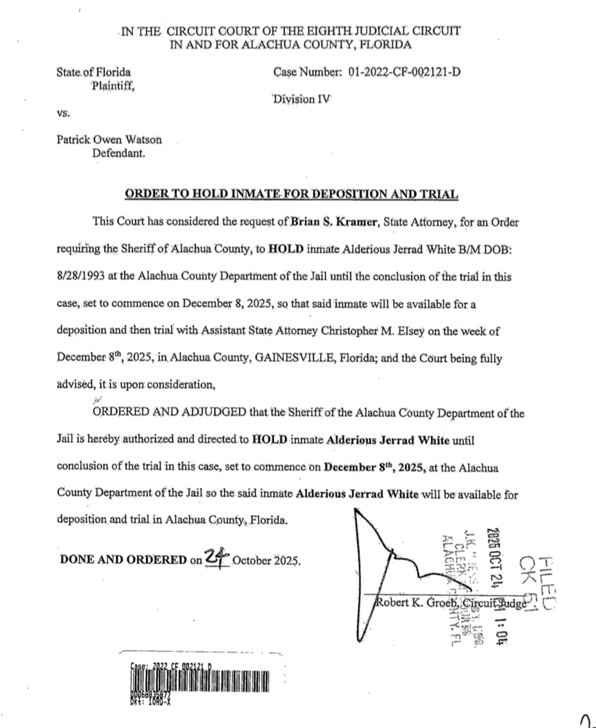Court documents in Watson’s case show White won’t be transferred to prison until his case is over, meaning White will remain in the Alachua County Jail for now.