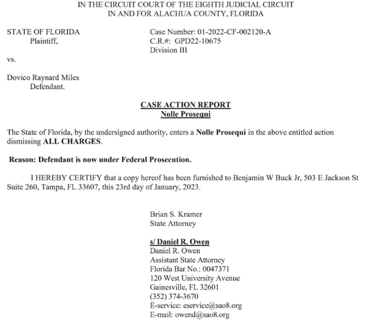Gainesville police arrested Miles after his niece’s murder and charged him with tampering with evidence for wrapping multiple guns up and placing them in an overgrown area, as well as possessing a firearm as a convicted felon.