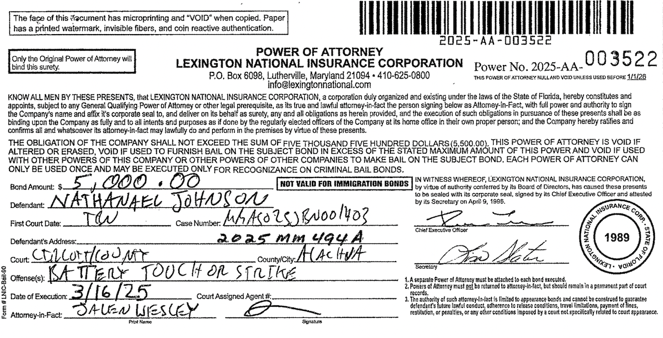 Gainesville Police Department officers arrested Nathanael Benjamin Johnson, 28, Monday and charged him with domestic battery by strangulation, a felony carrying a maximum prison sentence of five years.