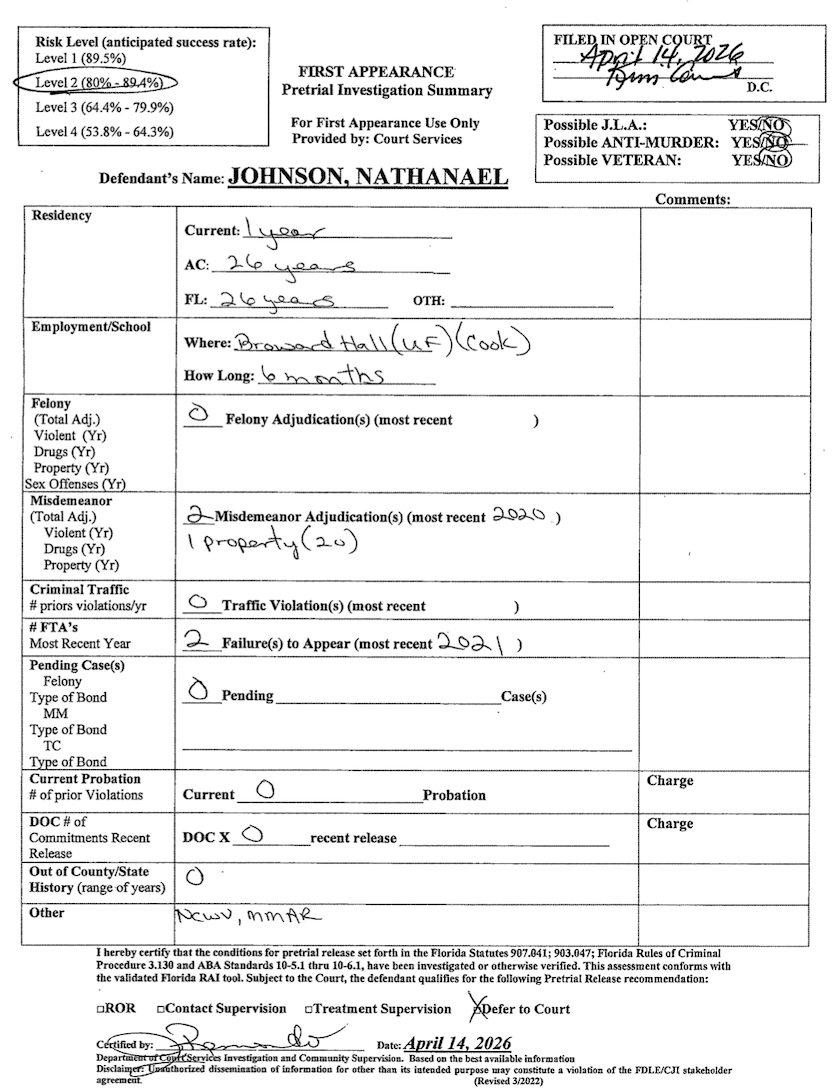 Johnson is reportedly employed as a cook in Broward Hall at the University of Florida.