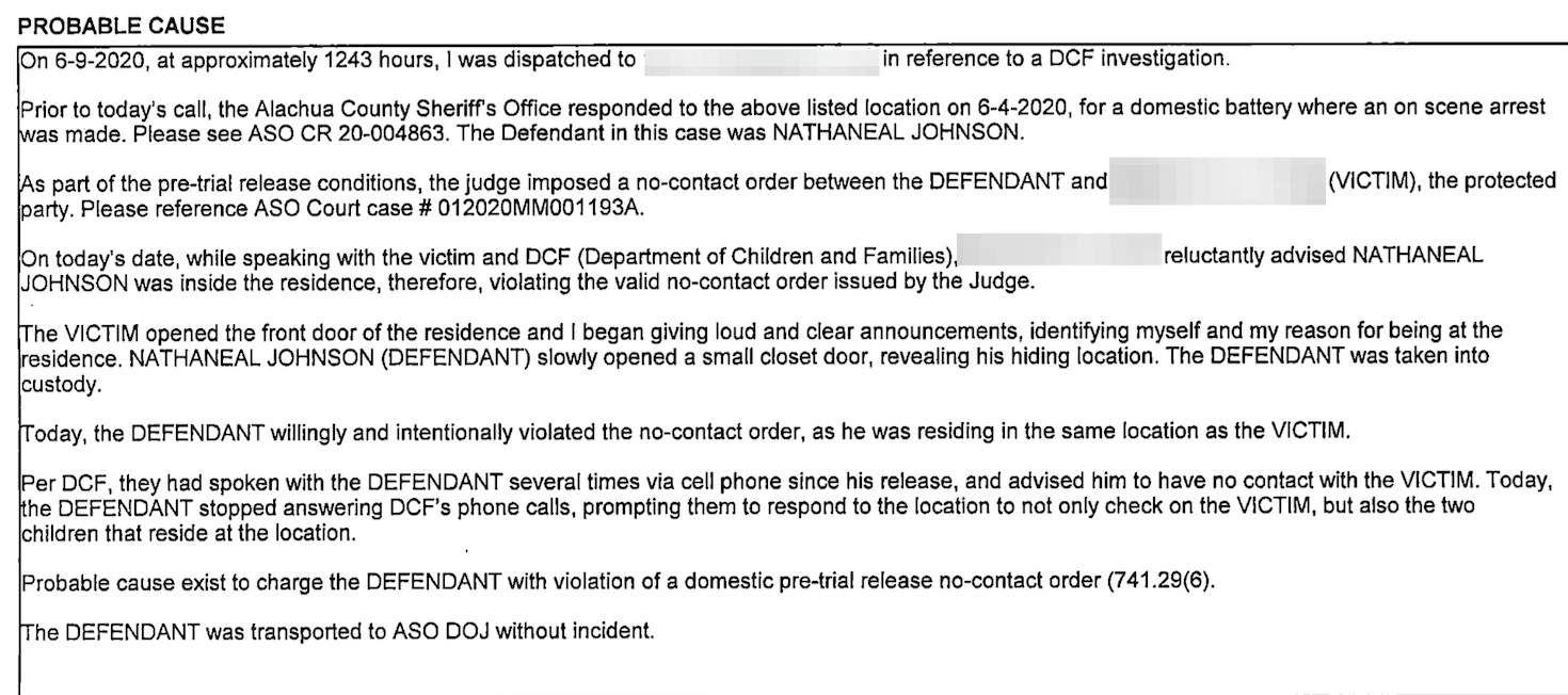 On June 4, 2020, Sheriff’s Office deputies arrested Johnson for allegedly committing domestic battery but the case was dropped and expunged. However, he was convicted of violating a no-contact order with the victim.