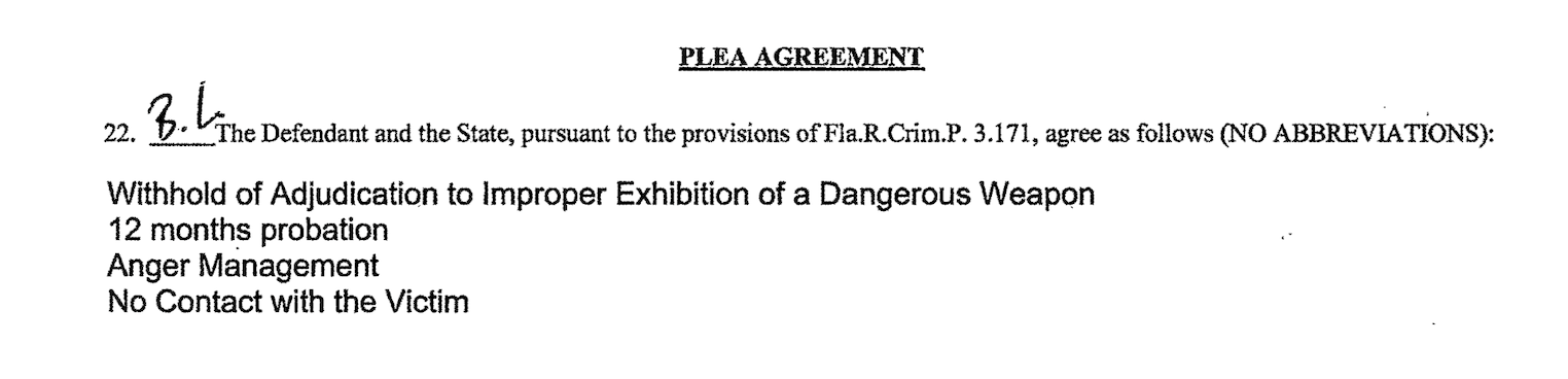 On November 7, 2024, Bryan Licona was granted a withheld adjudication of improperly exhibiting a dangerous weapon and sentenced to one year of probation, which he completed early in August 2025.