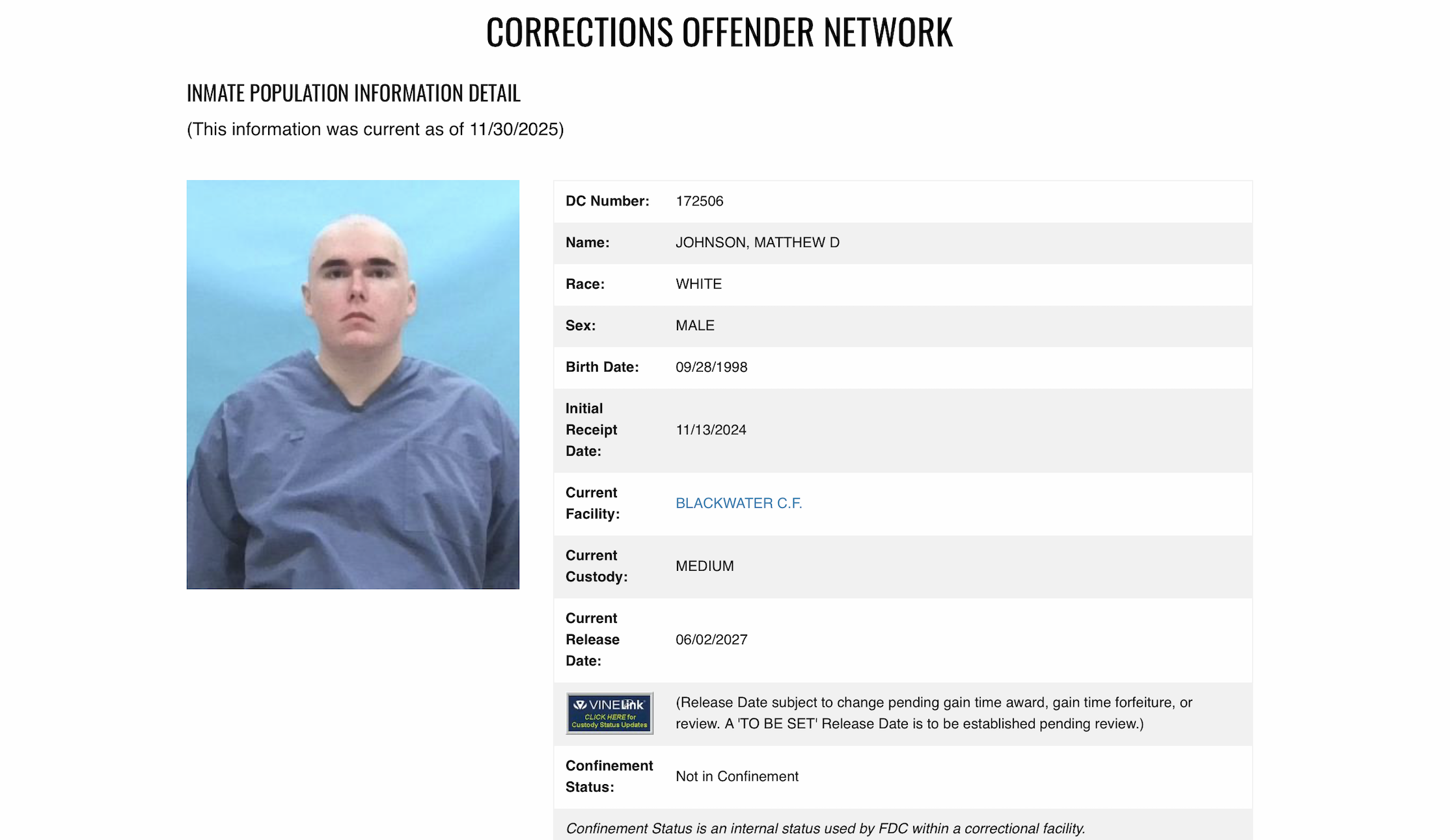 Johnson is currently housed in the Blackwater Correctional Facility, per the Florida Department of Corrections website.