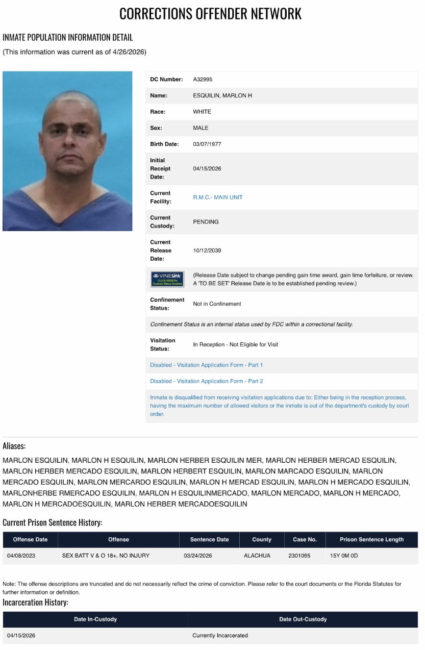 On April 15, 2026, the Florida Department of Corrections took Esquilin into custody and he’s currently at the Reception and Medical Center.