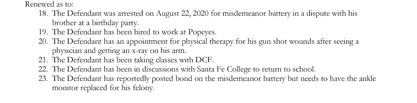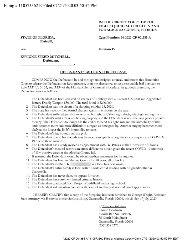 After his arrest, Speed-Mitchell’s public defender submitted another release motion, citing his client’s need for physical therapy. The motion adds that Speed-Mitchell was “in discussions with Santa Fe College to return to school.”Davis denied the motion.