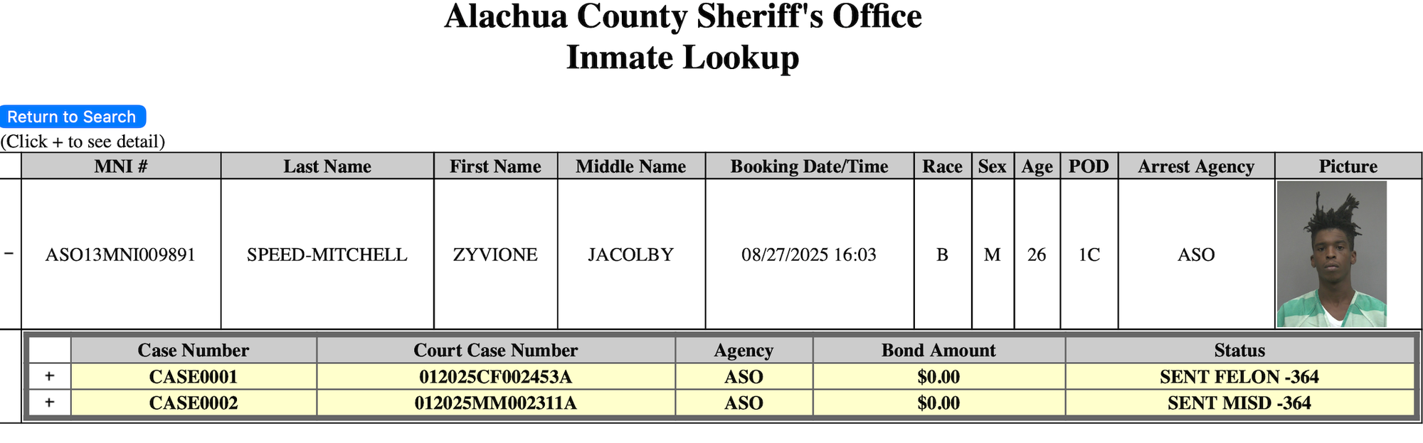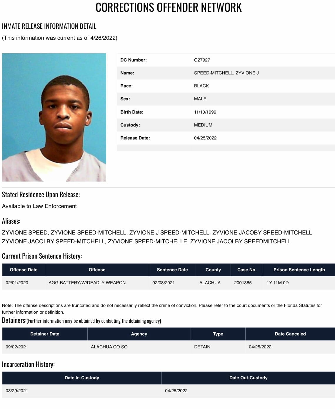 The Florida Department of Corrections website in correlation with court records indicates that Speed-Mitchell was released into the custody of the Alachua County Jail after completing his sentence in April 2022 due to the perjury case still being open.