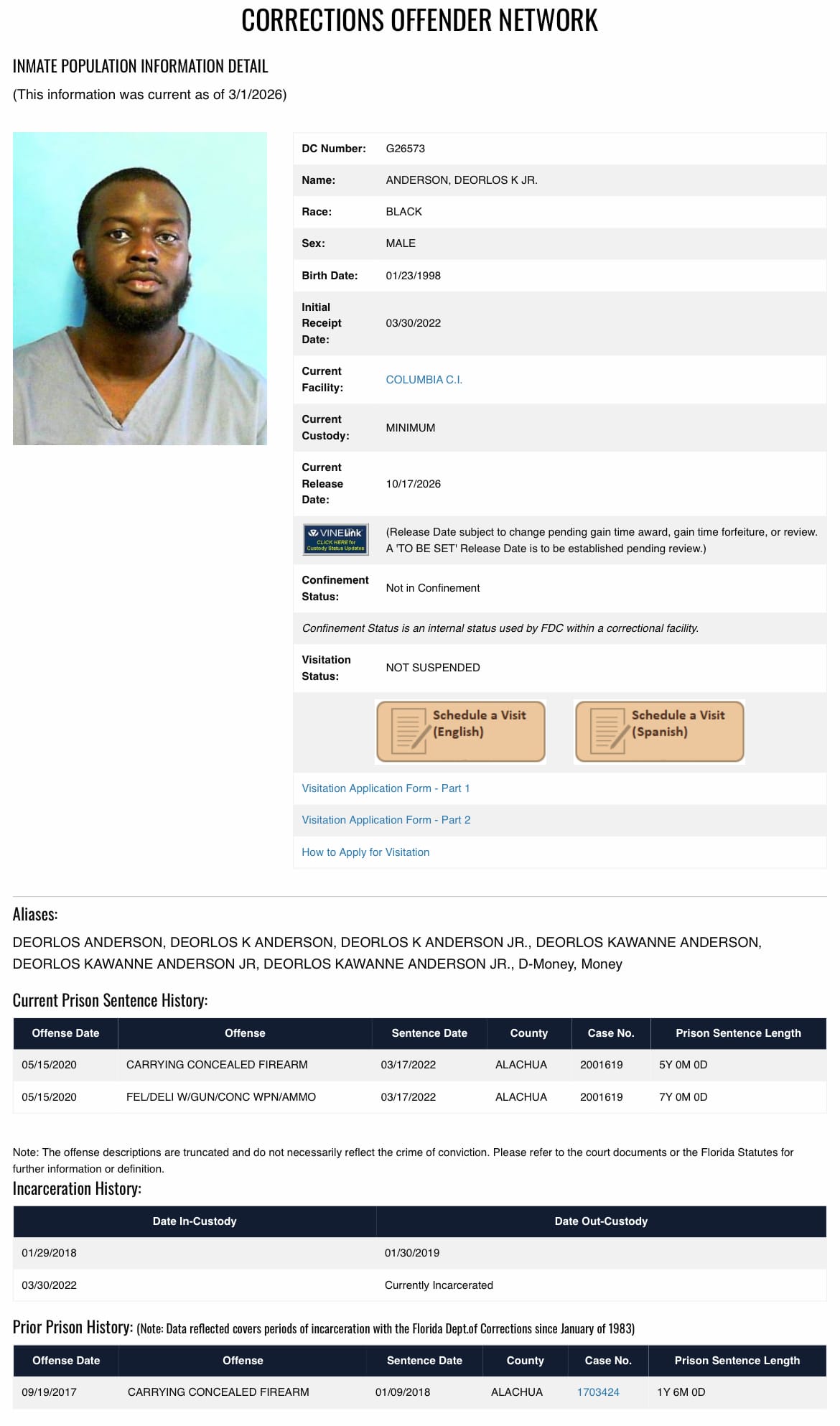 Anderson is serving his sentence at the Columbia Correctional Institution and is scheduled to be released on October 17, 2026.