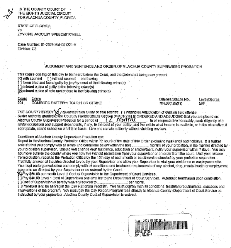 Court records in Alachua County show Speed-Mitchell has three felony convictions and 47 misdemeanor convictions, along with hundreds of dropped charges.