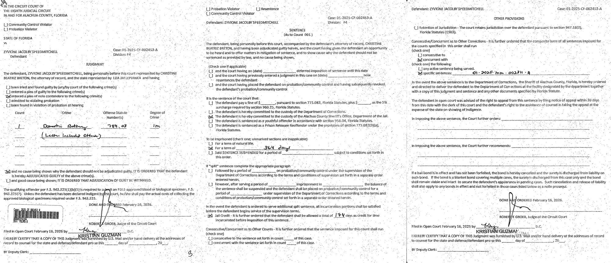 On February 16, 2026, Speed-Mitchell submitted another plea deal for the felony case, which was downgraded to a misdemeanor after he pleaded to a lesser included offense. As part of the plea deal, no extra time was added to the sentence.