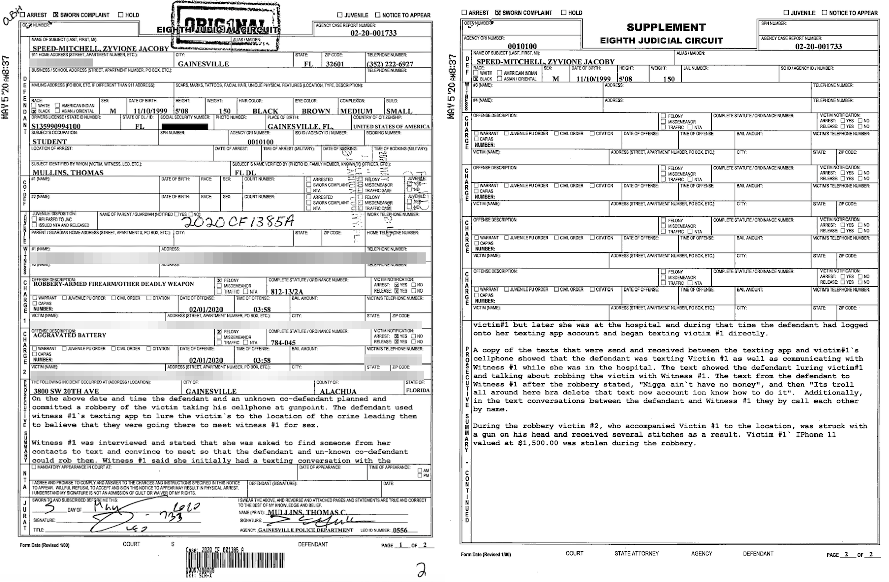 Alachua County Sheriff’s Office deputies found Speed-Mitchell walking near the incident location. Deputy Lloyd Smith reported: