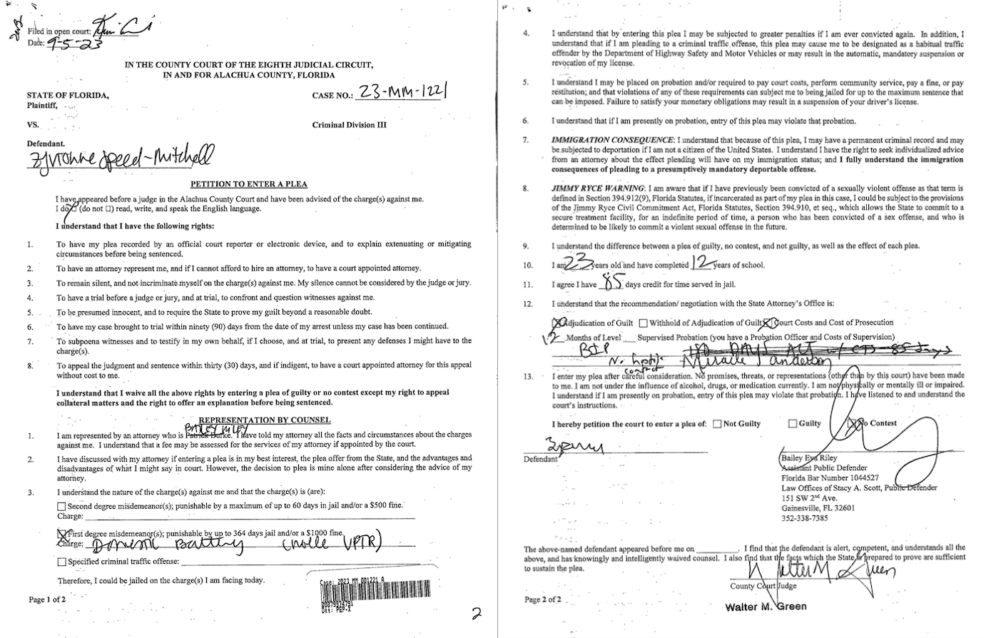 The no contest plea agreement shows a sentence of 180 days in jail with 85 days time served, however, this is crossed out. Judge Walter Green ultimately imposed a sentence of one year probation. Under the probation conditions, Speed-Mitchell was required to have “no hostile contact” with the victim and required to enroll in a batterer’s intervention program (BIP).