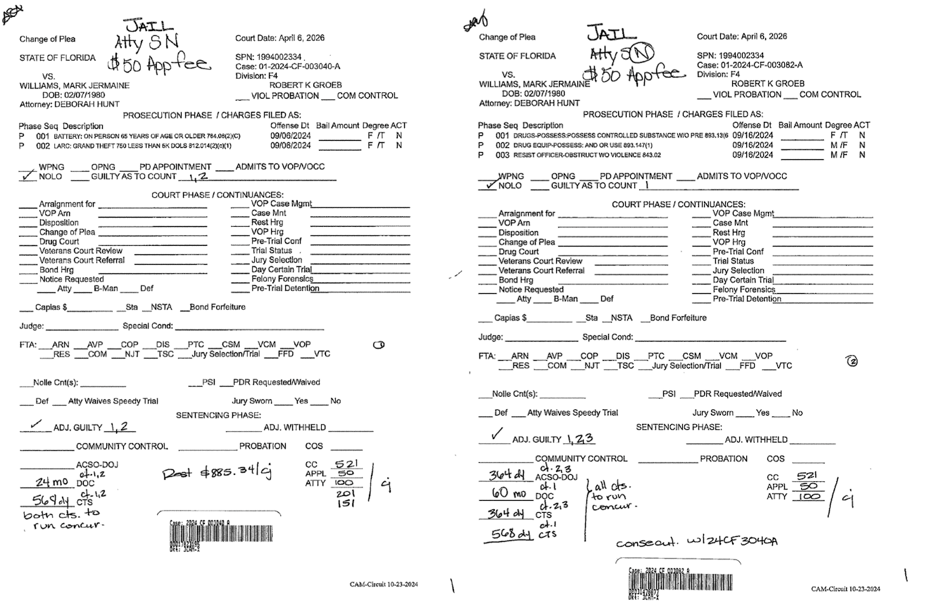 Monday morning, Mark Jermaine Williams, 46, was convicted of grand theft (felony), battery on an elderly person (felony), possession of a controlled substance (felony), possession of drug equipment (misdemeanor), and resisting an officer without violence (misdemeanor).