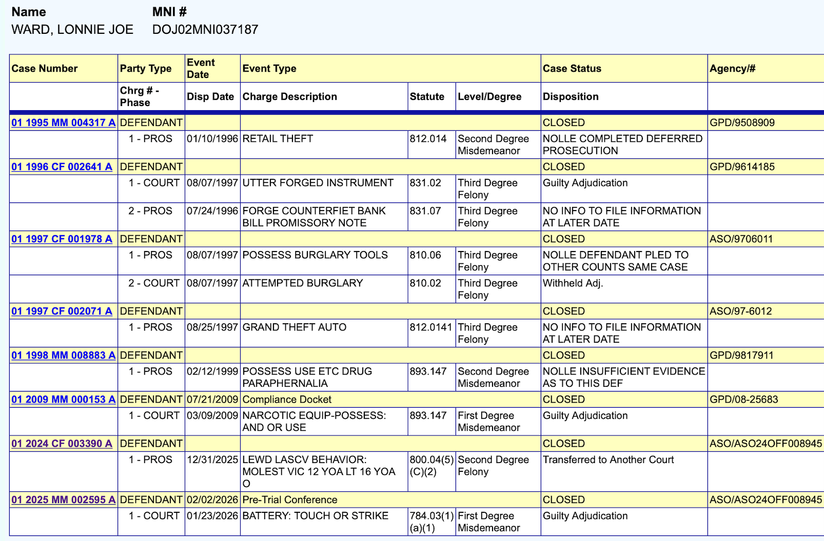 On January 23, 2026, Lonnie Joe Ward, 49, entered a no contest plea agreement for a misdemeanor battery charge and was sentenced to one year of probation.
