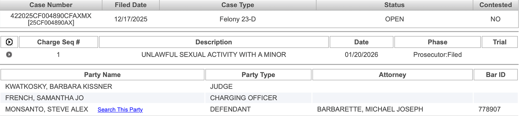 Further research into Steve Monsanto shows that he has an additional case in Marion County from December 2025 on a count of unlawful sexual activity with a minor. He was released on a $25,000 bond shortly after. Unlike the Leon County case, the Marion County case was not a sting and has a real victim. In spite of this, Monsanto was allowed to post bond again after allegedly attempting to victimize a child in Leon County.