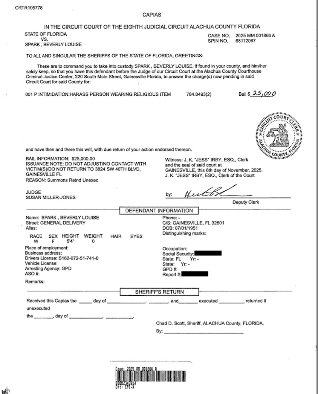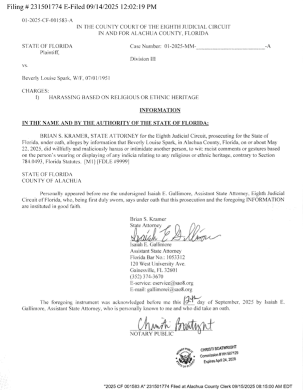 Beverly Louise Spark, 74, was booked into the Alachua County Jail Sunday afternoon after not receiving a summons on a count of harassment based on religious or ethnic heritage.