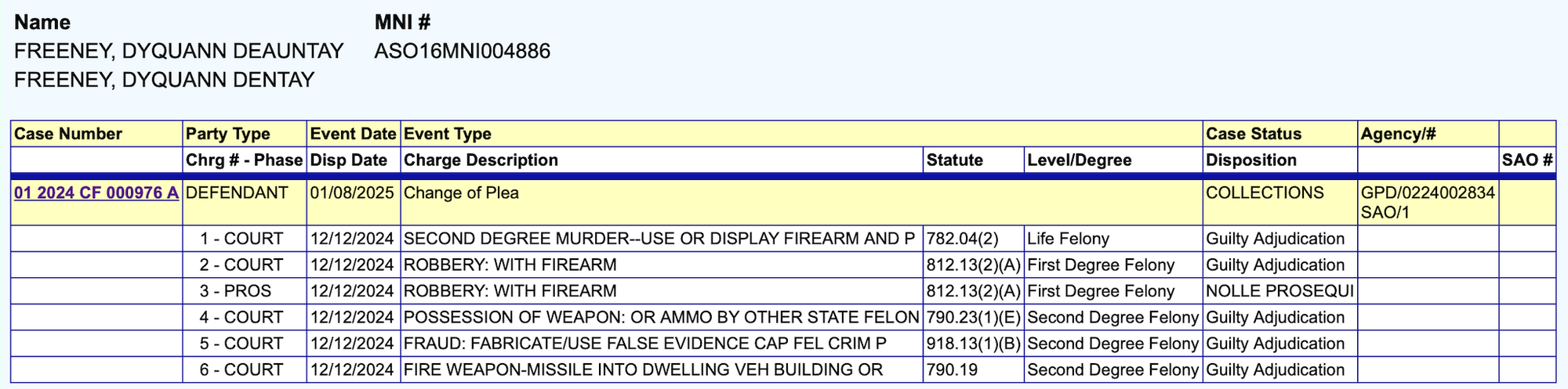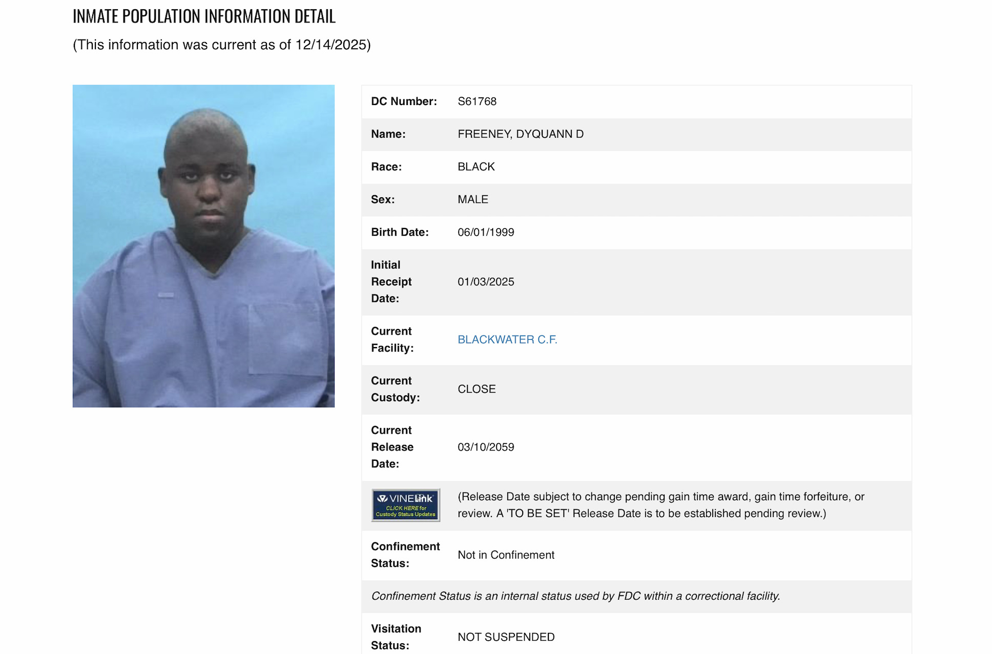 On December 12, 2024, Dyquann Freeney was convicted of second degree murder among other charges in a plea deal and sentenced to 35 years in prison.