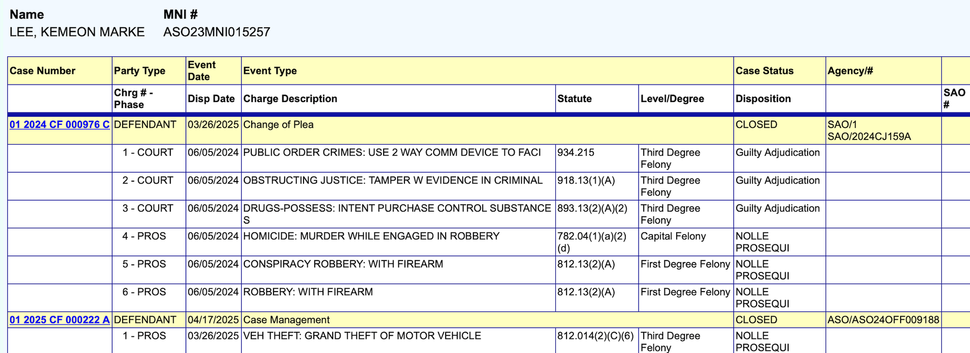 On June 6, 2024, Kemeon Lee was convicted of drug and tampering charges in a plea deal and sentenced to five years of probation. Lee beat the homicide and guns charges he was initially facing. In January 2025, he was charged with vehicle theft but prosecutors dropped the case.
