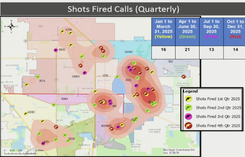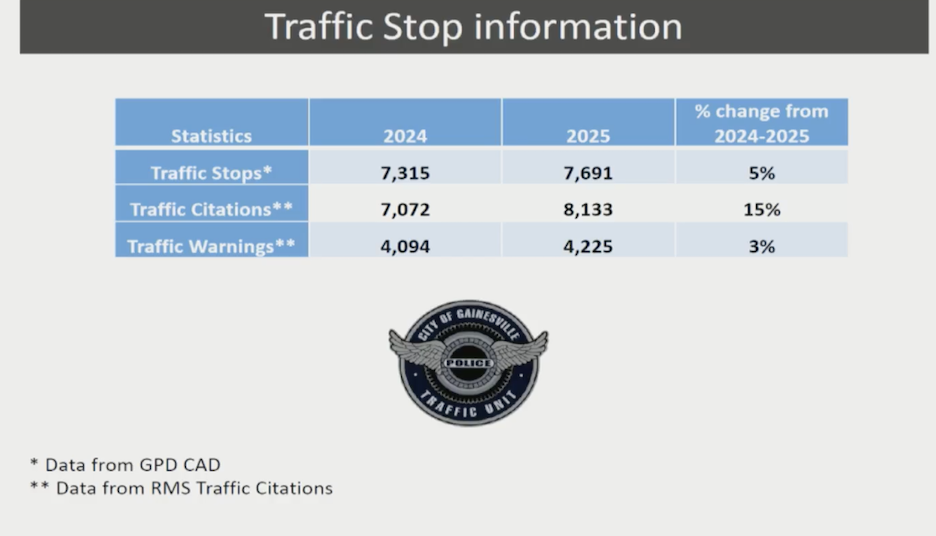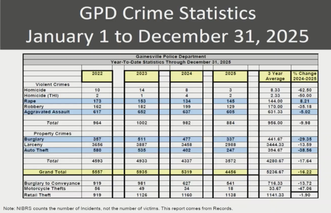 At the Gainesville City Commission meeting on Thursday, February 5, the Gainesville Police Department (GPD) gave their quarterly update for October-December 2025. The update focused heavily on yearly statistics.
