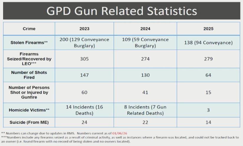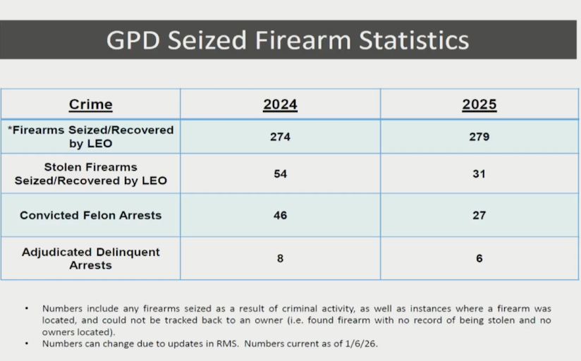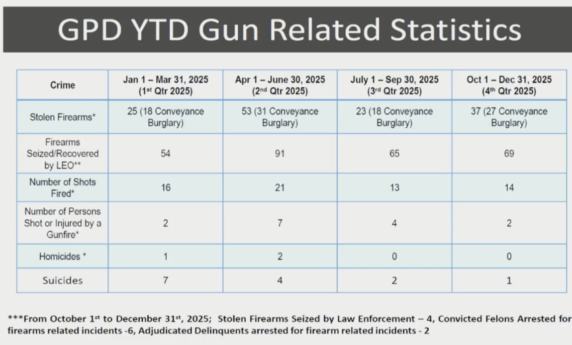 Capt. Summer Hallett shared statistics showing the GPD Gun Violence Unit conducted a total of 389 traffic stops in 2025 and pressed charges against 120 individuals for gun violence.
