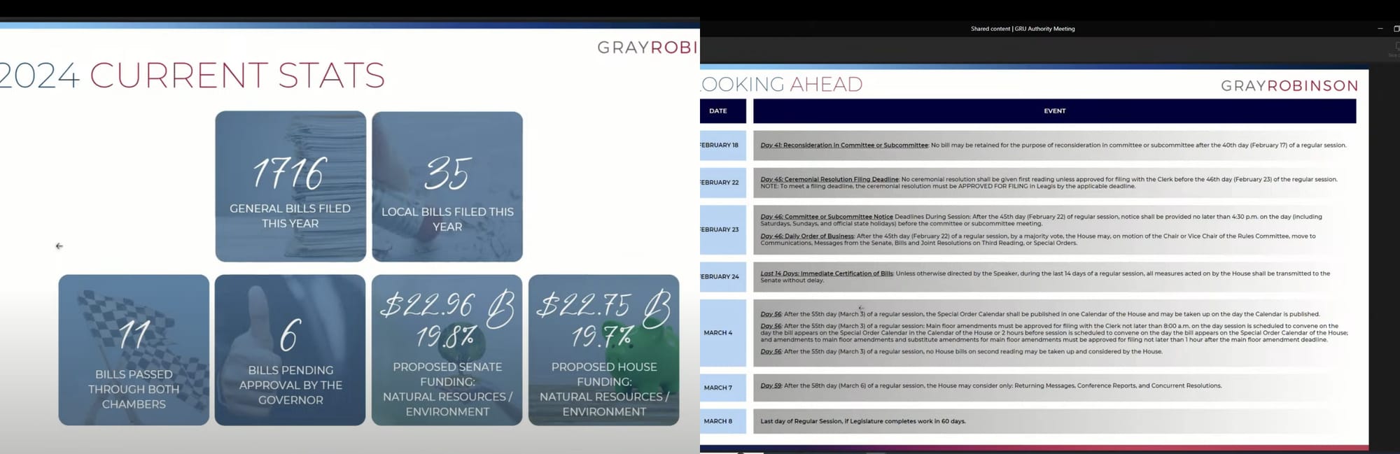 Moving onto the first agenda item, the board heard a presentation over Facetime from GRU’s state lobbyist, Ryan Mattews, with Gray Robbinson Law Firm.