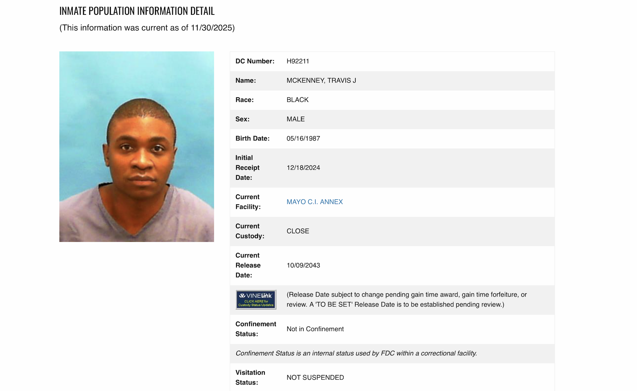 McKenney is currently incarcerated in the Mayo Correctional Institute, per the Florida Department of Corrections website.