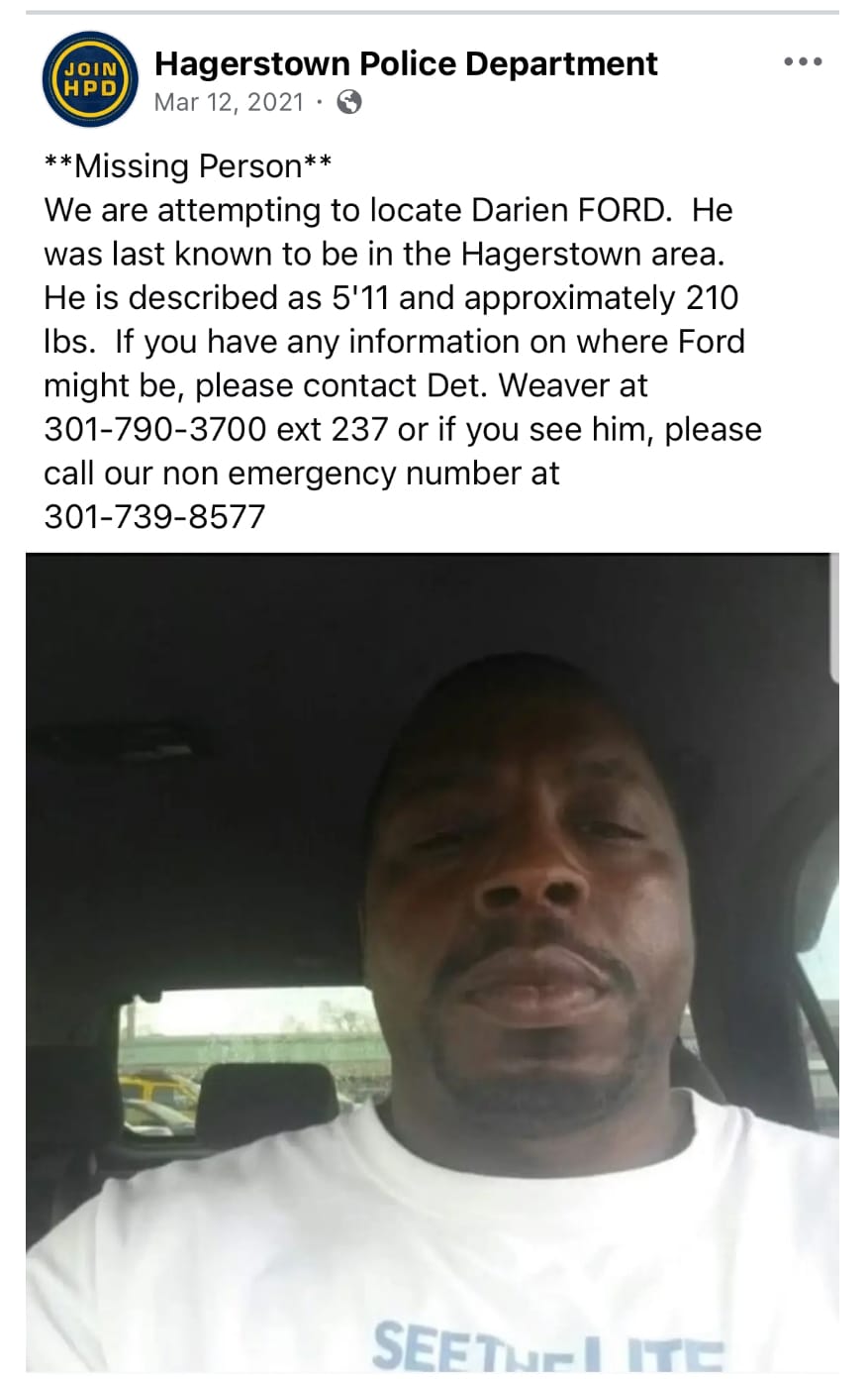 On March 12, 2021, the Hagerstown Police Department made a missing persons post about Ford, asking anyone with information on his whereabouts to contact them.