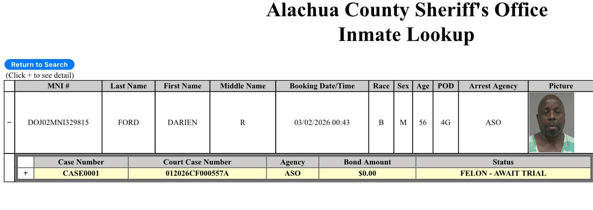 Alachua County Sheriff’s Office (ACSO) deputies have arrested Darien Revwell Ford, 56, on a Maryland warrant for involuntary manslaughter.