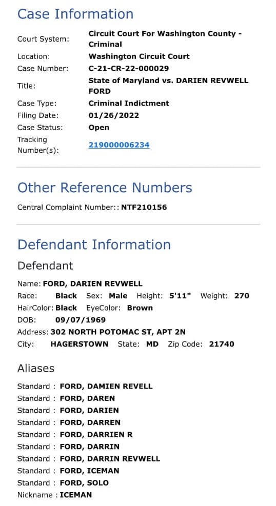 Back in 2017, Ford was convicted in Hagerstown after shooting himself with a firearm he possessed illegally, along with cocaine distribution. According to Herald Mail Media, “Assistant Public Defender Robert Sheehan said Ford was unable to recall whether he shot himself in a suicide attempt, by accident, or other means… The cocaine distribution charge came from a controlled purchase of crack cocaine at a downtown Hagerstown bar… A warrant for Ford's arrest on the drug charge was issued on July 12, 2016, two days before he was found wounded in City Park.”