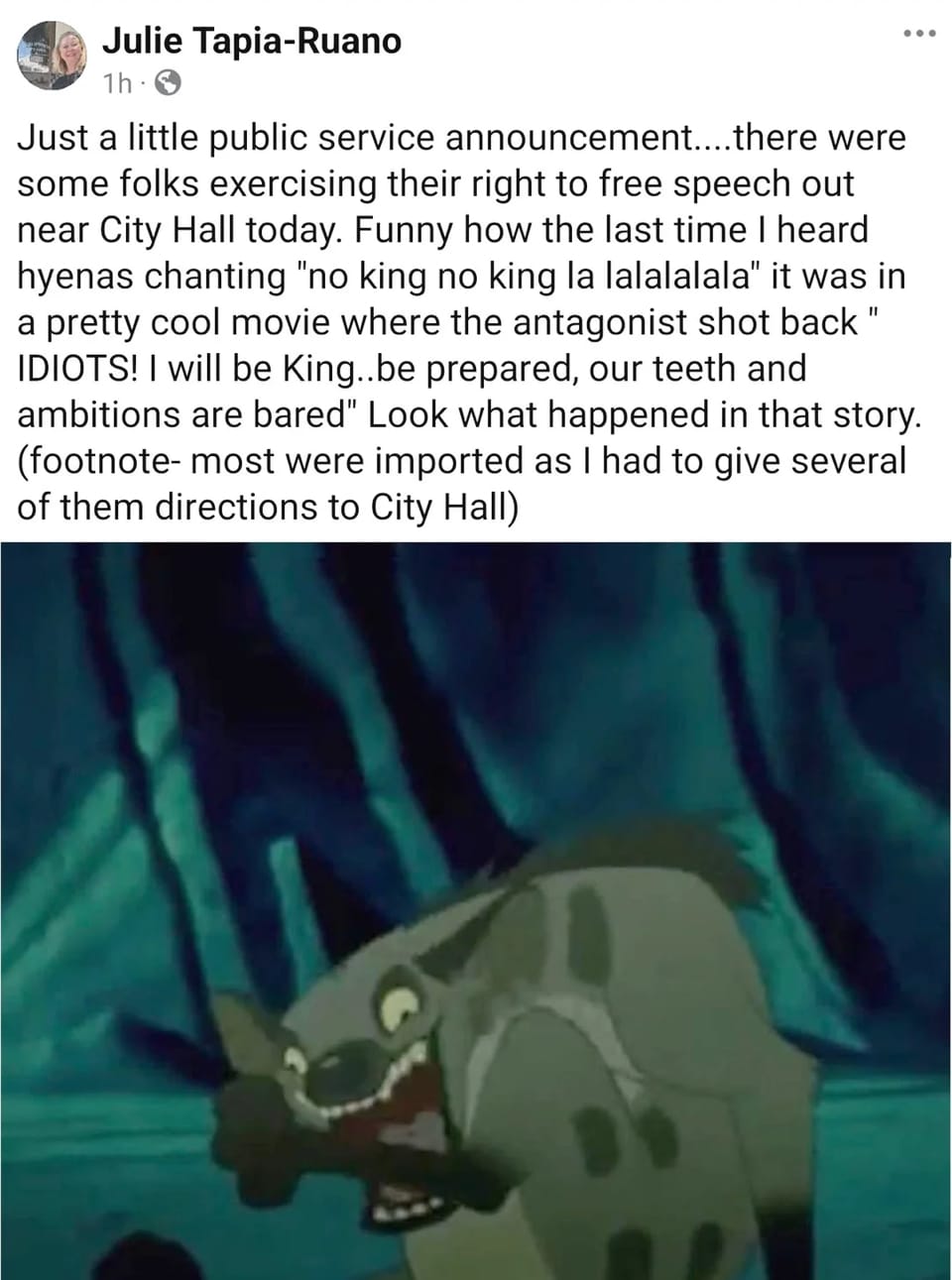“Just a little public service announcement,” said commission seat 3 candidate Julie Tapia-Ruano. “There were some folks exercising their right to free speech out near City Hall today. Funny how the last time I heard hyenas chanting ‘no king no king la lalalalala’ it was in a pretty cool movie where the antagonist shot back ‘IDIOTS! I will be King..be prepared, our teeth and ambitions are bared’ Look what happened in that story. (footnote- most were imported as I had to give several of them directions to City Hall).”