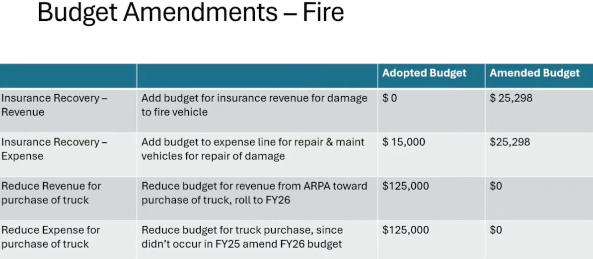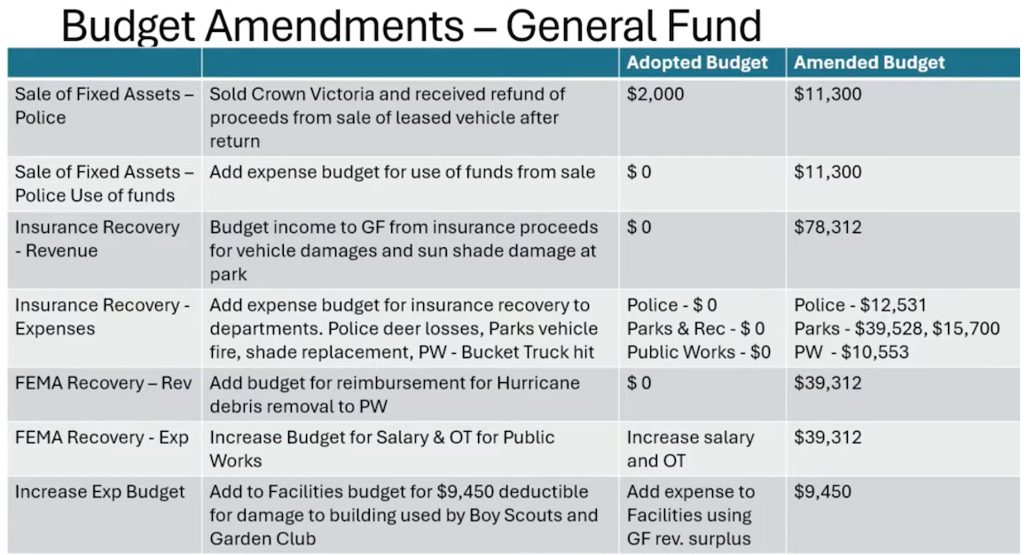 Wilson said the city will be collecting insurance money from several police vehicles that hit deer, a parks and recreation pickup truck that burned down to the ground and a canopy and fire equipment that were destroyed during Hurricane Helene.