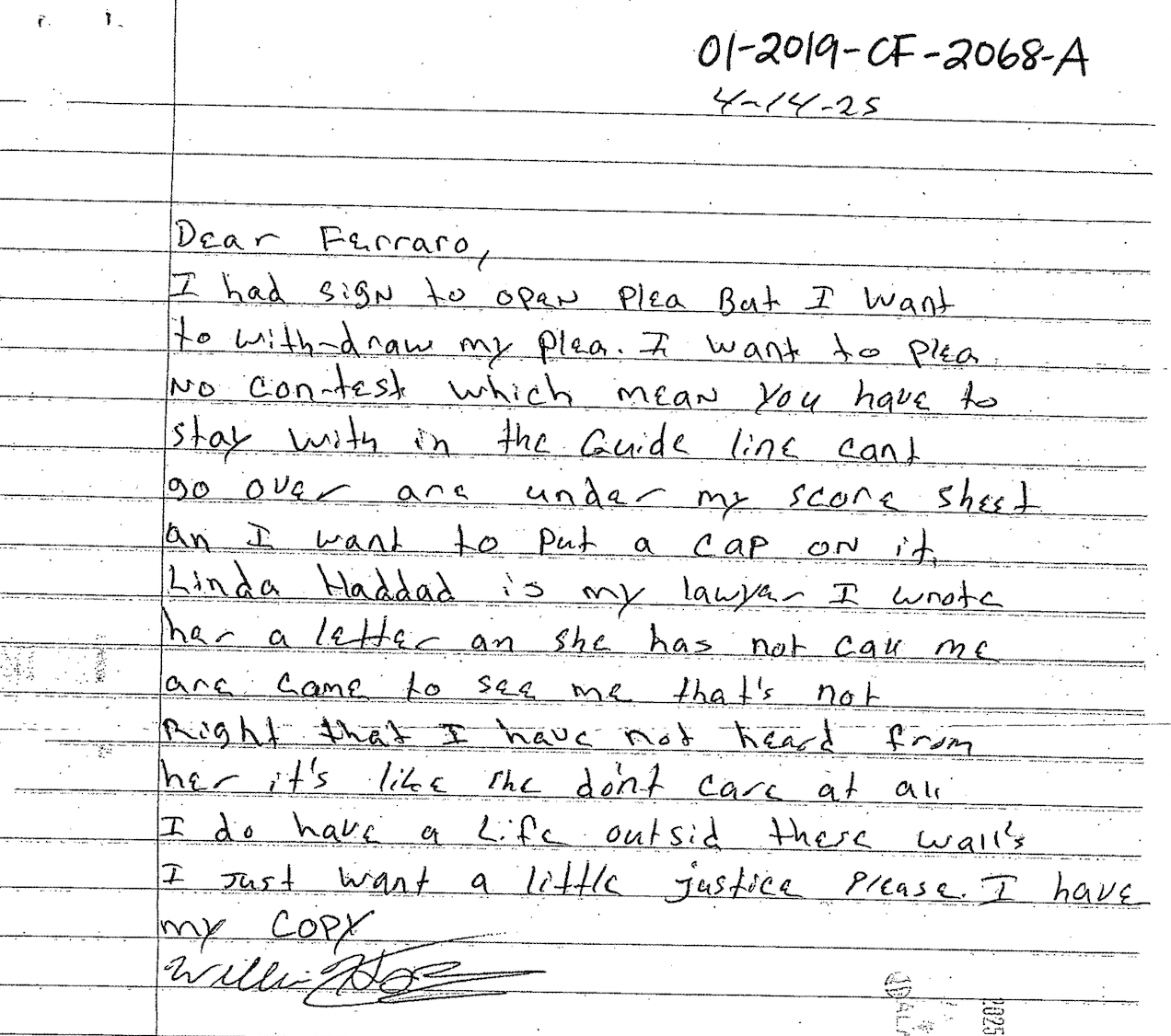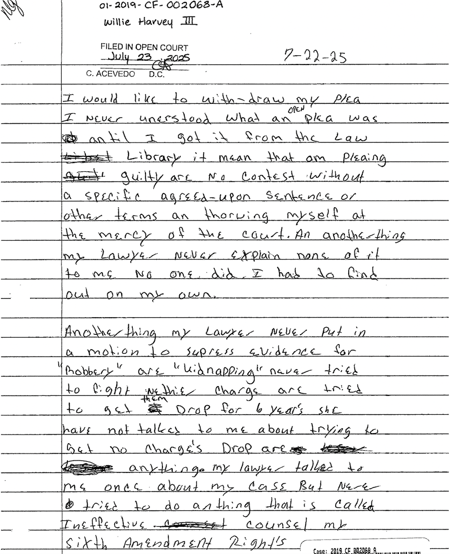 On April 14, 2025, Harvey asked Ferrero to revoke his plea deal, saying he didn’t intend to take an open plea. Some plea deals come with a prior sentencing agreement between the prosecutor and defense, while open pleas leave sentencing up to the judge’s discretion.