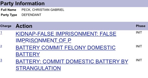 The arrest report states Peck let go, and the victim began slapping him in self-defense before grabbing her car keys and phone and attempting to leave; however, Peck snatched both items out of her hands. The victim continued trying to leave, and Peck reportedly stepped in front of the door and pushed her away from it.