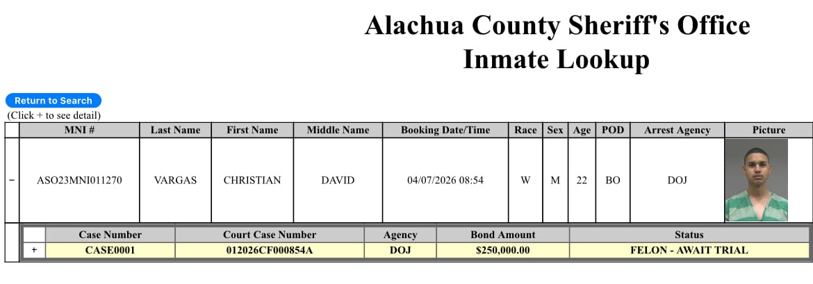 A search of the Alachua County Jail booking log indicates Vargas has already bonded out just hours after his arrest, as he is not among the list of inmates as of around 11 p.m. this morning. This is similar to Vega's arrest, as he also bonded out the same day he was booked into jail.