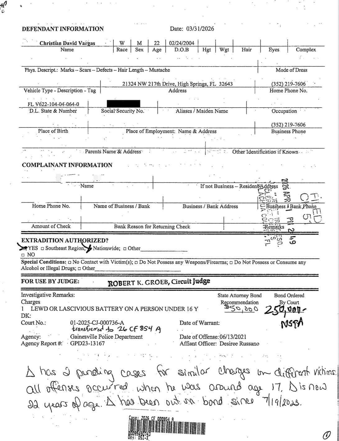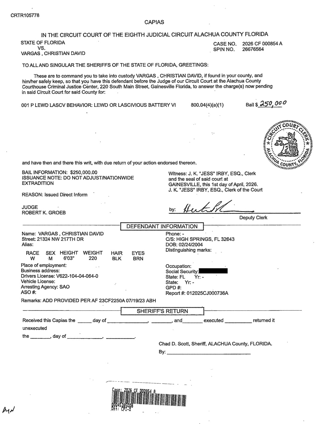 In 2025, Vargas was hit with an additional charge of lewd or lascivious battery in juvenile court, however, the case was transferred to the felony division last week. A warrant was subsequently issued, with Judge Robert Groeb ordering Vargas to be held in jail on a $250,000 bond.