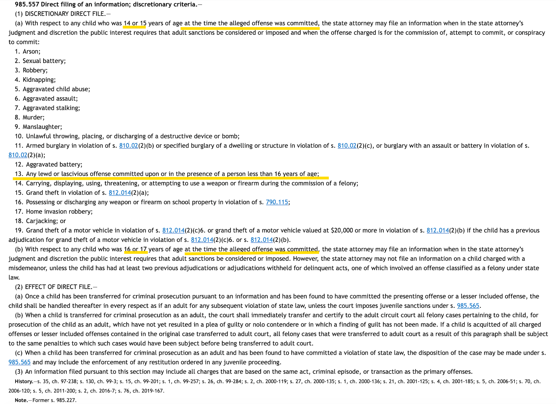 The document states Vargas is being prosecuted pursuant to Florida Statue 985.557, which states, "With respect to any child who was [14-17] years of age at the time the alleged offense was committed, the state attorney may file an information when in the state attorney’s judgment and discretion [of] public interest requires that adult sanctions be considered or imposed..."