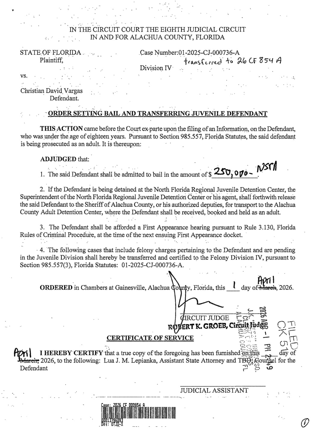 The only court document that is currently viewable is titled “Order setting bail and transferring juvenile defendant,” however, the document states Vargas should be transferred “if” he is in juvie. The document doesn't make any confirmations regarding Vargas’ whereabouts or incarceration status. The document states Vargas will be "afforded a First Appearance hearing" in accordance with the law "at the time of the next ensuing First Appearance docket."