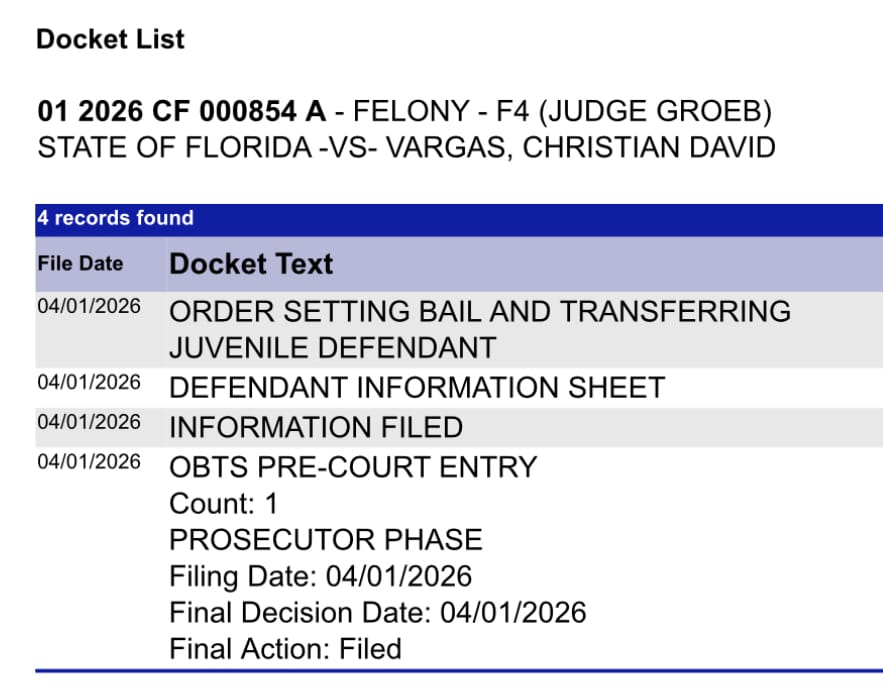 On April 1, 2026, the case was transferred from juvenile court to the felony division (adult court). Juvenile cases are generally exempt from public records, so the case is only coming out publicly now.