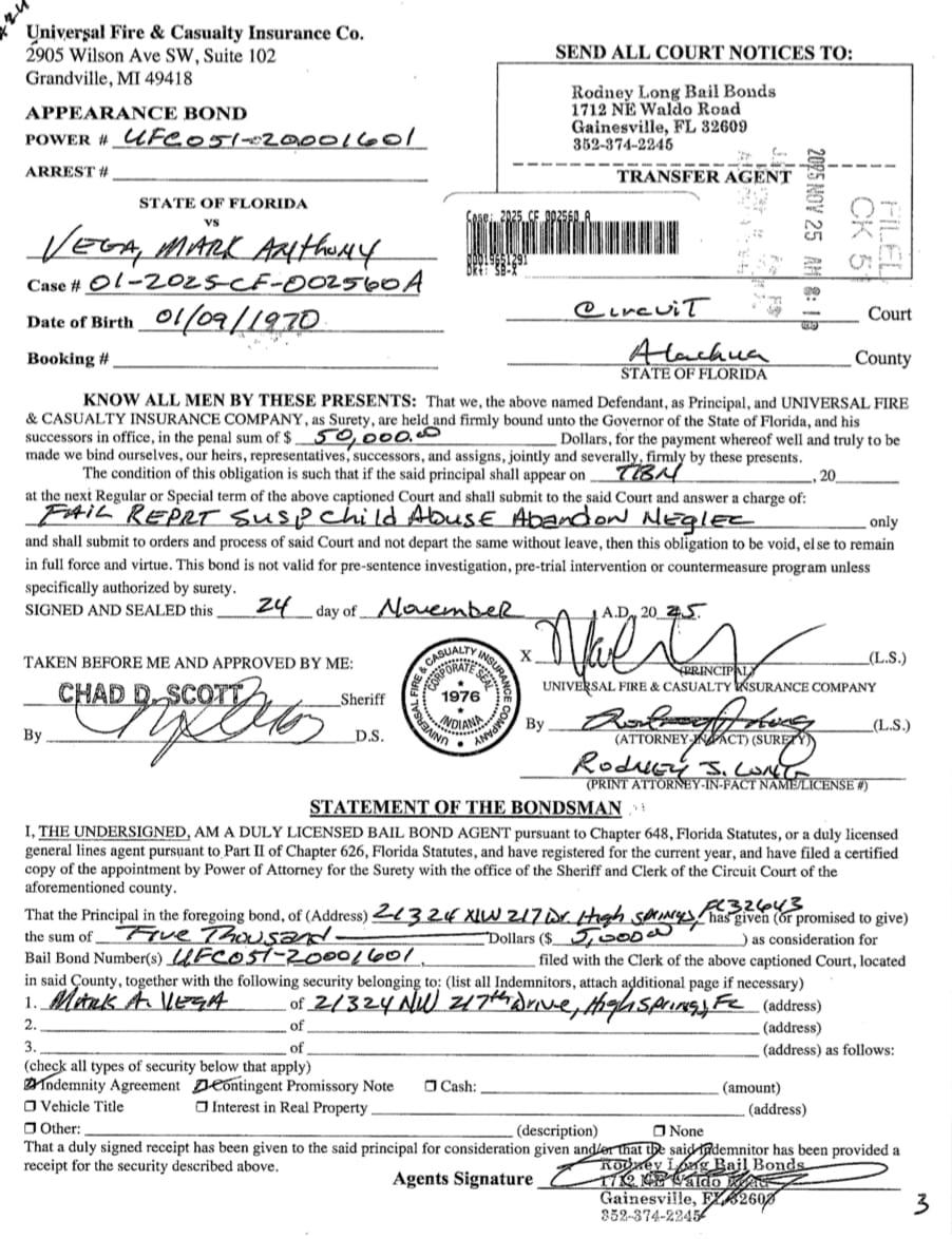 An Alachua County Jail employee told GnvInfo that Vega's $50,000 bond has already been paid for. She said she doesn't know who paid the bond but confirmed they accepted it from a bondsman.