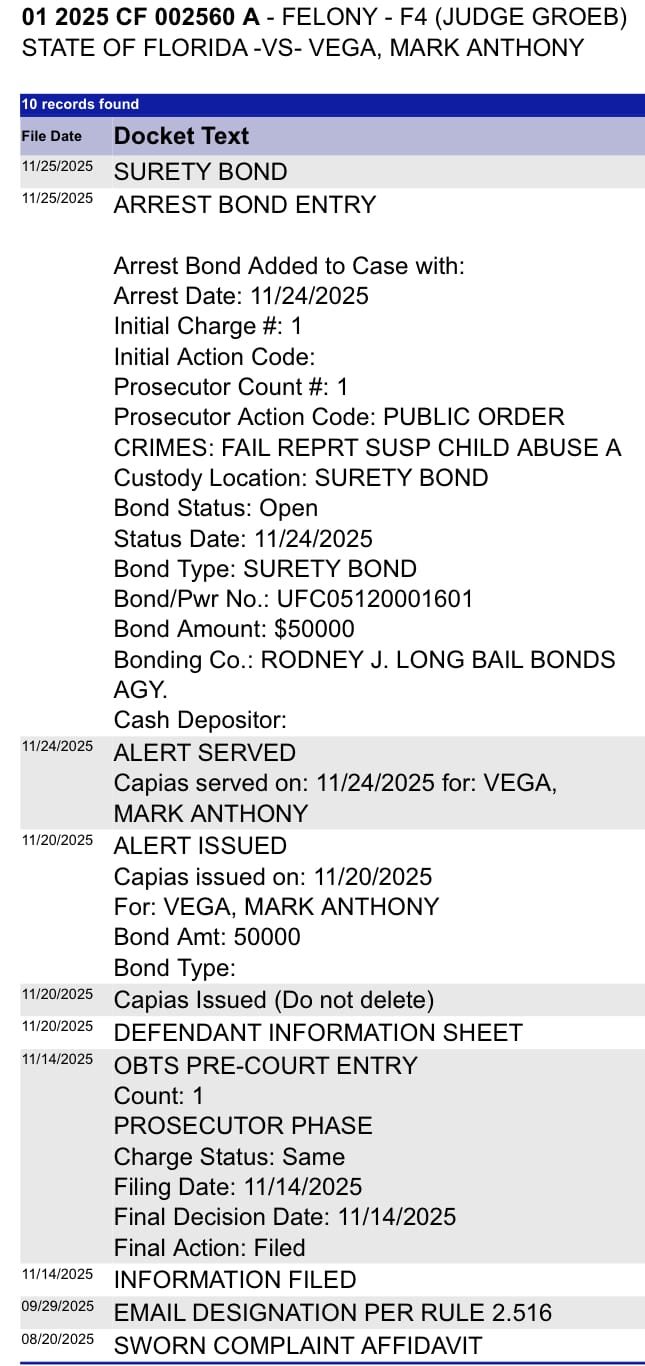 Update | November 25: Vega’s bond form has posted to the court records website.