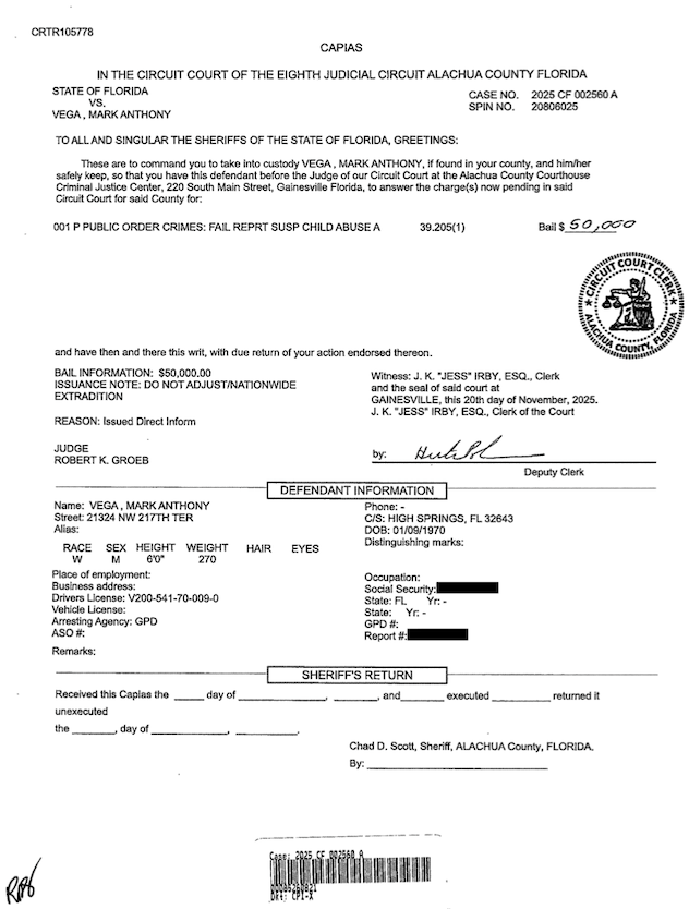 Update | Nov 26: The Alachua County Sheriff's Office has confirmed Vega turned himself in, telling GnvInfo in an email, "The defendant voluntarily surrendered at the Department of Justice Lobby pursuant to an active warrant originating from Gainesville Police Department Incident No. 02-25-006544... Be advised that surveillance footage regarding the defendant’s presence in the lobby and subsequent jail processing is exempt from public disclosure under Fla. Stat. § 119.071(3)."