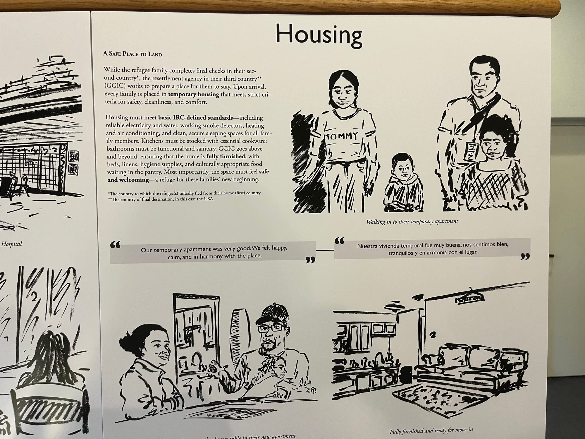 The GGIC art exhibit contains a section on housing that says, “Every family is placed in temporary housing that meets strict criteria for safety, cleanliness, and comfort.”