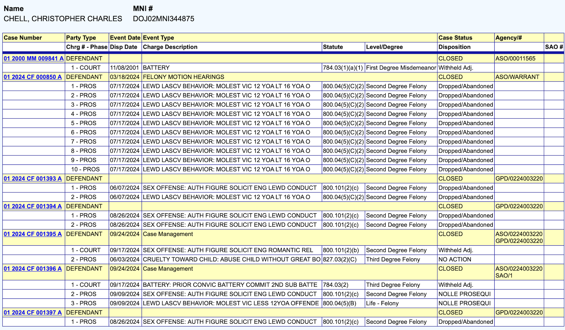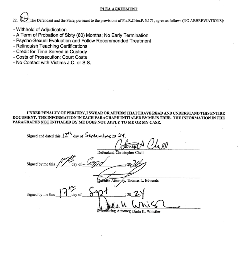 State Attorney Brian Kramer’s Office of the Eighth Judicial Circuit dropped several cases against Chell. The plea agreement was signed off by prosecuting attorney Darla Whistler.