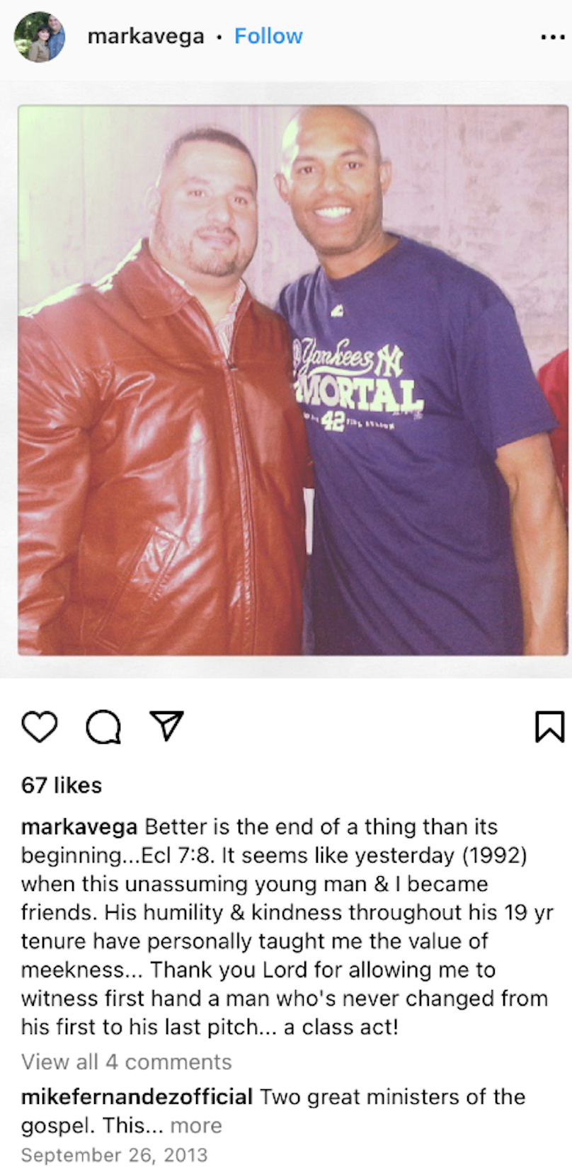Vega has a longstanding friendship with New York (NY) Refuge of Hope Church pastor and former professional baseball player Mariano Rivera.