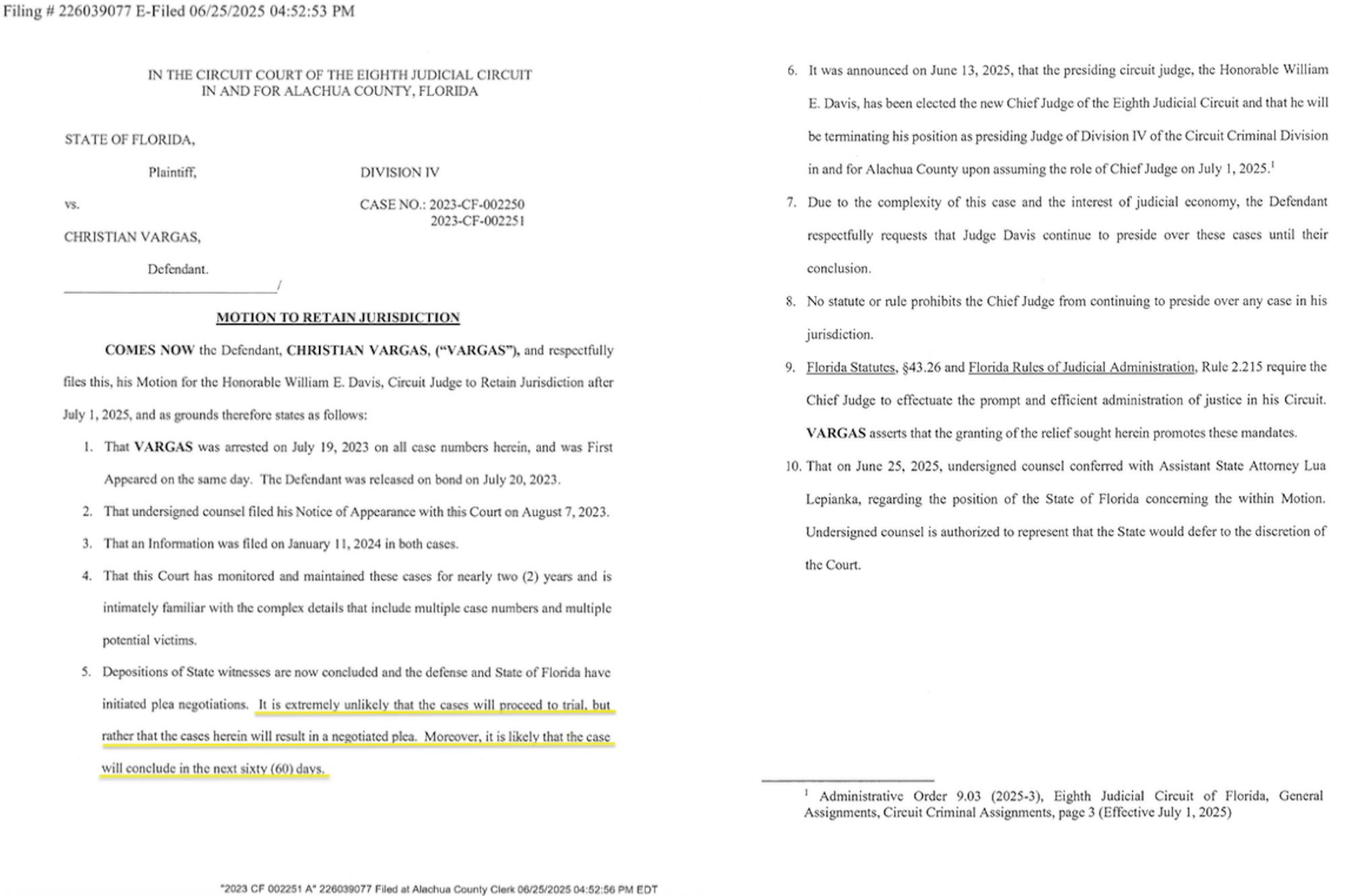 On June 25, 2025, Vargas’ lawyer, Gilbert A. Schaffnit, made a motion to keep Judge William Davis presiding over Vargas’ cases.