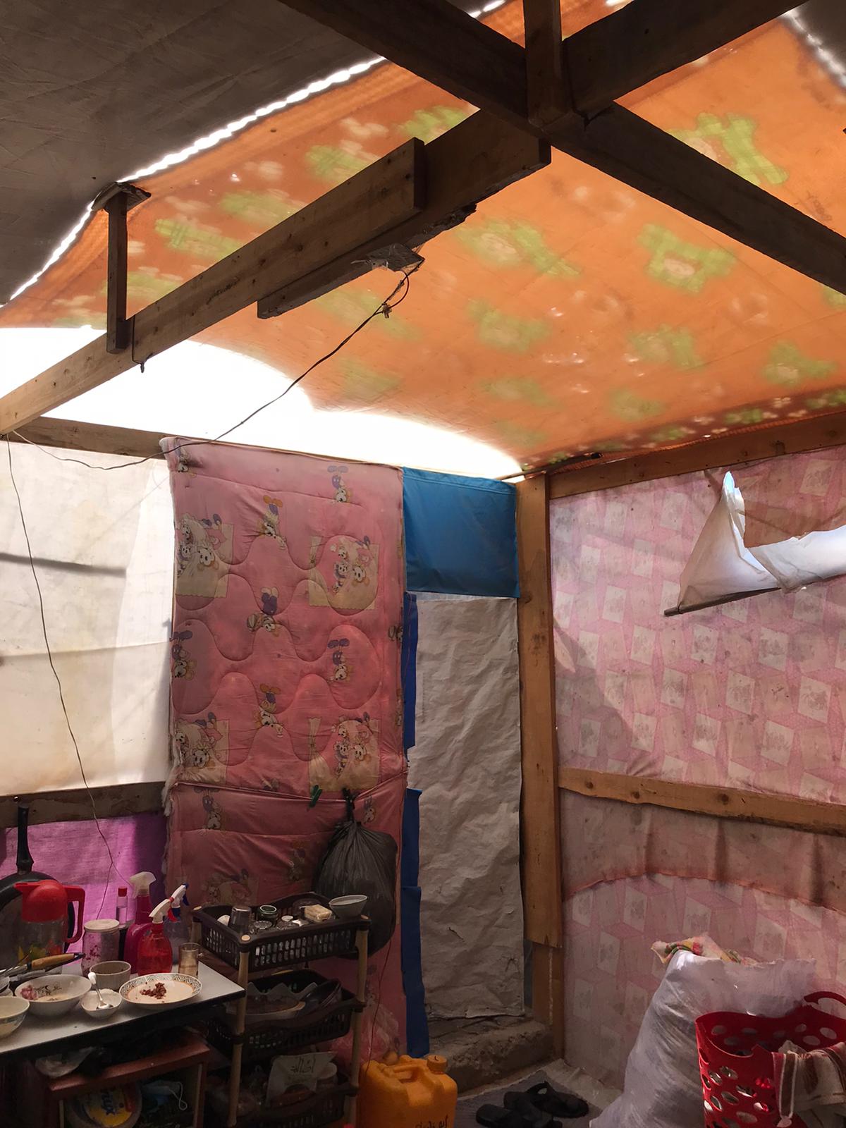 انا الان اعيش مع عائلتي في خيمة ، وافراد عائلتي ثمانية هم الوالدين و الإخوة واخوتي اربعة منهم نساء ولدي اخي الصغير ، جمعينا نعيش في خيمة مساحتها سبعة متر مربع.