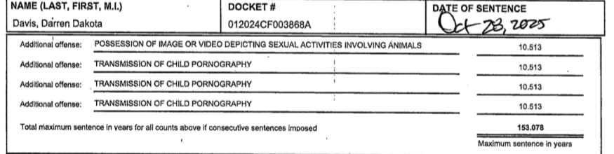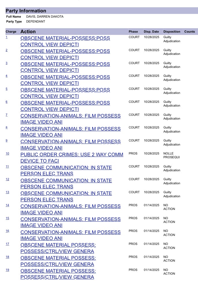 On October 28, 2025, Darren Dakota Davis, 25, was sentenced to ten years in prison following a no contest plea and conviction of 12 charges relating his possession and sharing of child sexual abuse material (CSAM), as well as his possession of sexual abuse material involving animals.