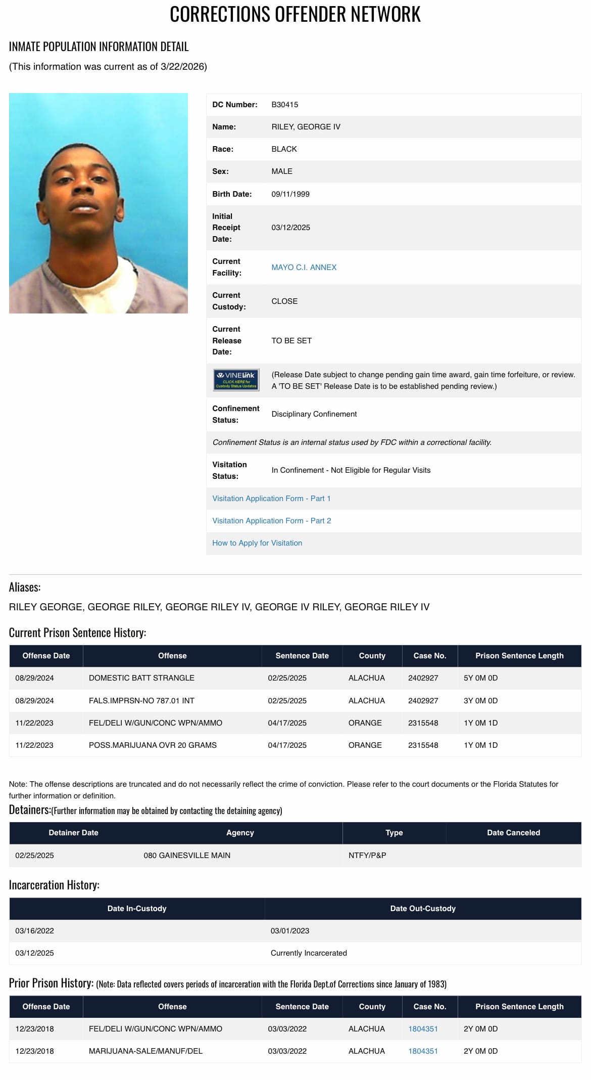 On February 25, 2025, George Riley IV, 26, was sentenced to eight years in the Florida Department of Corrections (FDC) following a no contest plea and conviction of two felonies, domestic battery by strangulation and false imprisonment, in addition to a misdemeanor count of battery, court records show.