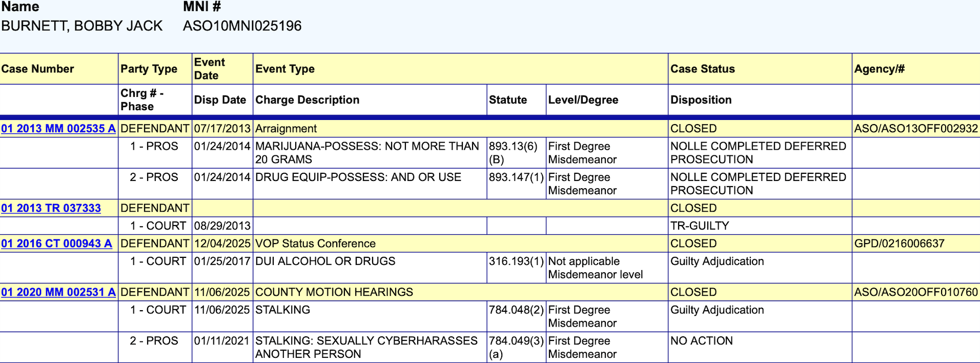 Burnett also has a drunk driving case dating back to 2016, for which he was arrested, convicted and sentenced to one year of probation. However, the case was resolved alongside his stalking case because he violated his probation in 2017 and never answered for it until his stalking warrant was served.