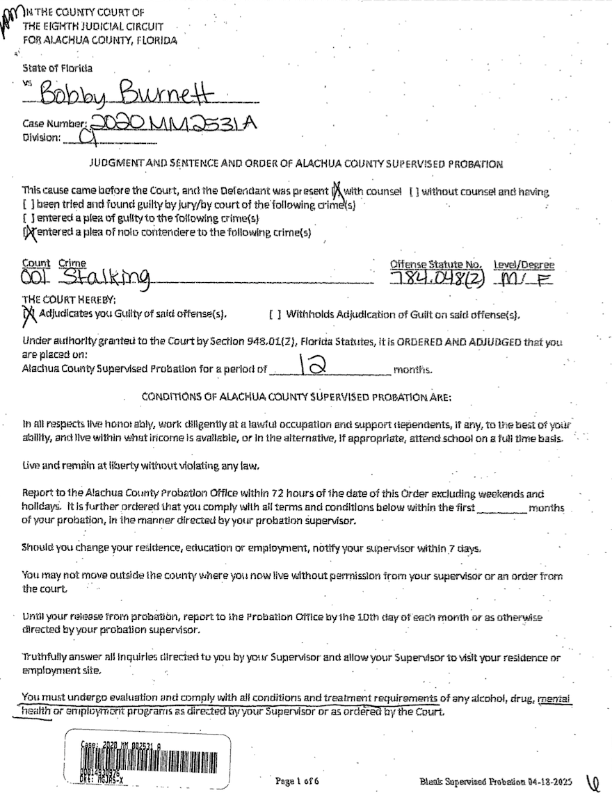 Burnett was initially charged via sworn complaint by the Alachua County Sheriff’s Office in December 2020 with stalking and sexual cyber-harassment, but prosecutors dropped the latter count when filing his case.